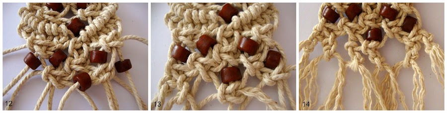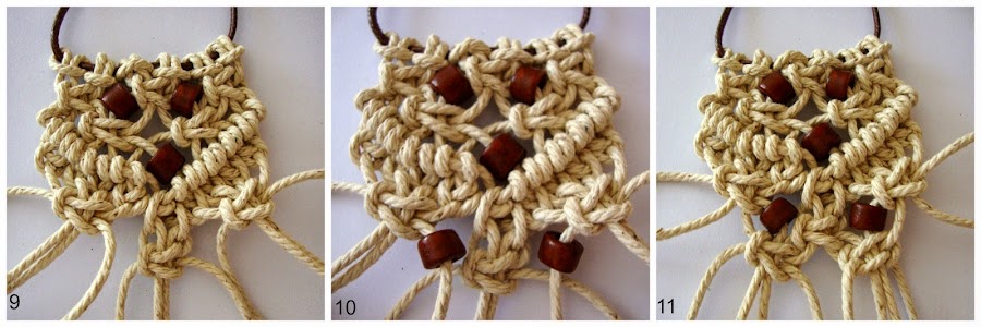 13- Separando de nuevo las hebras en 3 grupos de 4, ahora todas ellas para repetir 3 nudos planos, uno bajo cada abalorio.