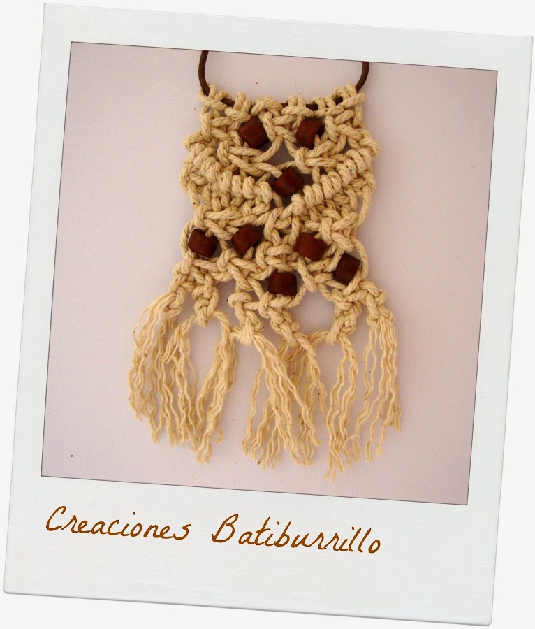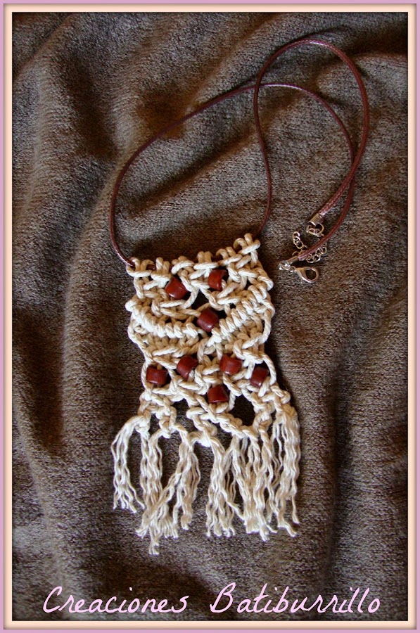 Es un modelo rústico, trenzado con cordel de empaquetar ataviado con cuentas marrones cilíndricas. Todo ello sobre un cordón de bisutería con cierres metálicos.