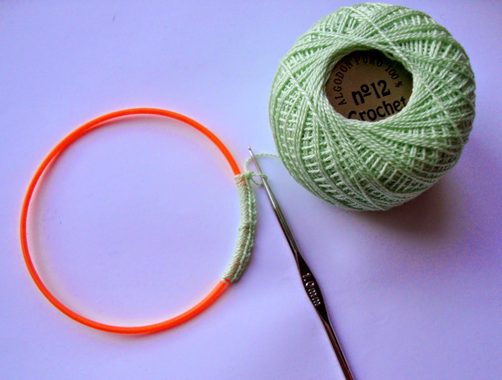 Para hacer el el soporte del mandala me ayudé de una pulsera de plástico (igual que en los atrapasueños )que podéis cubrir rodeando de hilo dándole vueltas alrededor o haciendo una vuelta de puntos bajos muy juntos.