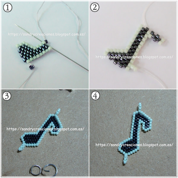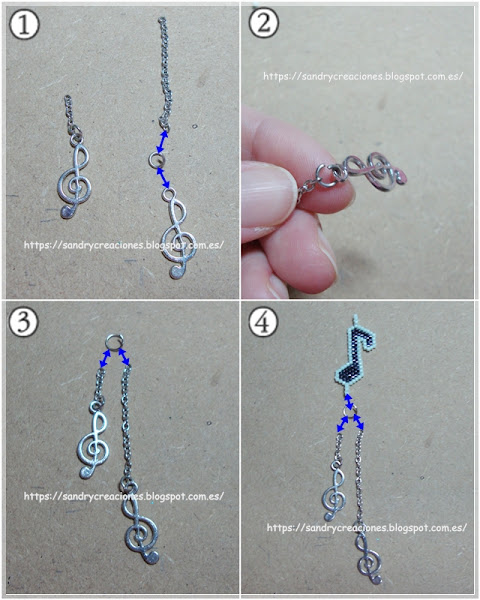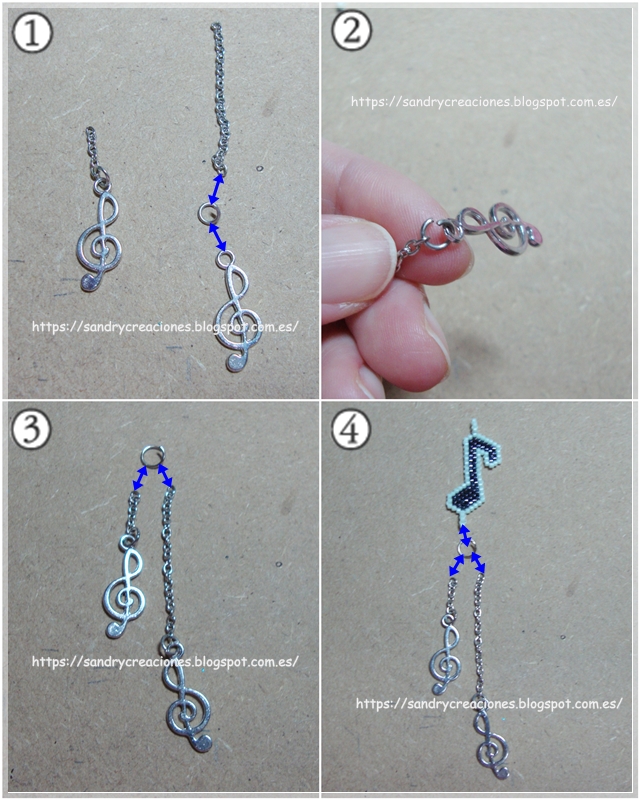 Paso 3. Unir los diferentes motivos a la cadenita. Primero cortaremos dos trocitos de cadenita, uno más largo que el otro y en su extremo inferior añadiremos una anilla pequeña y una de las claves de sol (imágenes 1 y 2). Una vez realizados estos dos colgantes los uniremos mediante otra anilla un poquito más grande (imagen 3) y que a su vez los uniremos con la corchea tejida con Miyuki Delica (imagen 4).