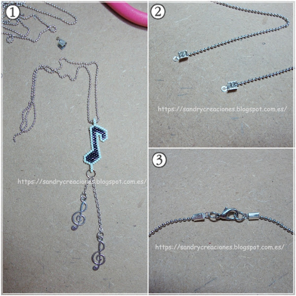 Paso 4. Ajustar la medida del colgante y ponerle el cierre. Una vez tengamos realizado el montaje del colgante pasamos un trozo largo de cadenita por la argollita superior de la corchea (imagen 1) y miramos la longitud que queremos que tenga la cadenita y cortamos la sobrante. A cada uno de sus extremos ponemos un terminal chafa (imagen 2) con una gotita de cola de cianocrilato para que el montaje quede más asegurado y los cerramos con unos alicates planos y/o redondos, seguidamente ponemos una anilla a cada uno y en uno de los lados un cierre mosquetón (imagen 3).