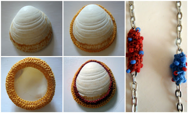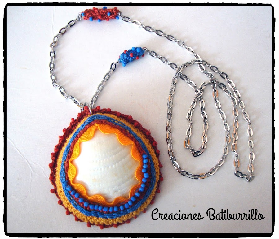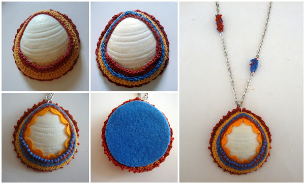 Paciencia, imaginación, combinación de colores y materiales: crochet (tejido y bordado sobrepuesto), abalorios, cinta tripa de pollo, fieltro, cadena plateada y arandelas.