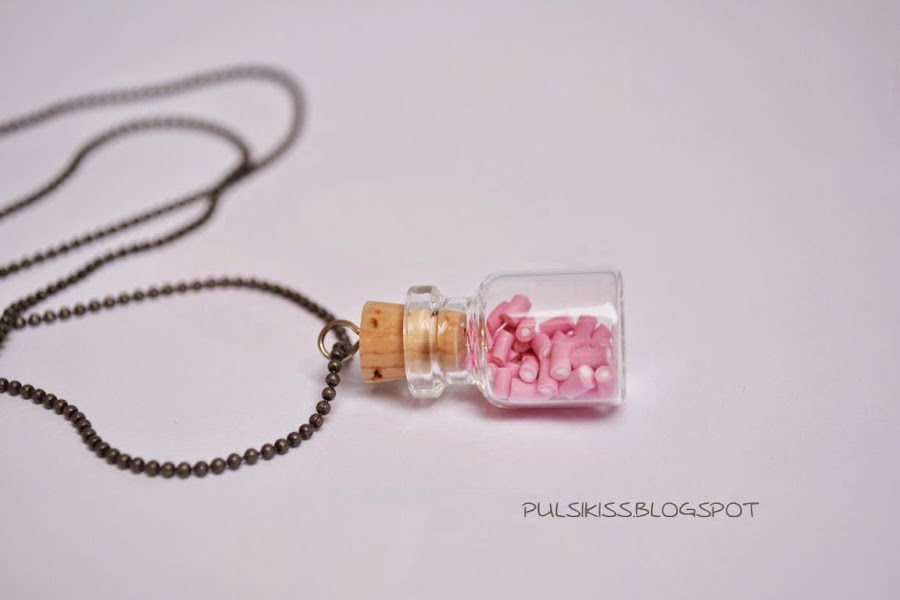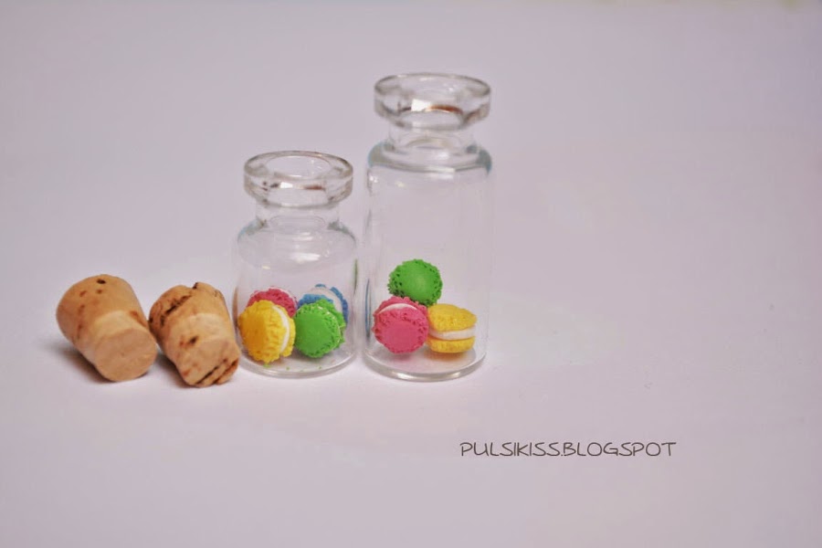 Se trata de botellitas de cristal, de 3 cm y de 4 cm que he rellenado con nubes de chuches, de regaliz rojo y de macarons de colores.