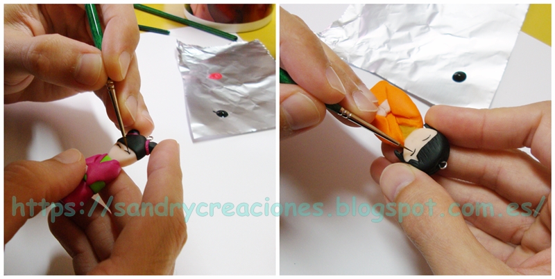 Tras esta media hora y una vez las muñecas se han enfriado podemos proceder a realizar los detalles de la cara con pintura acrílica y un pincel fino. Para empezar podemos marcar muy suavemente con lápiz los diferentes detalles que queramos hacer (boca, ojos, etc..) y luego con mucho cuidado aplicar la pintura acrílica del color deseado.