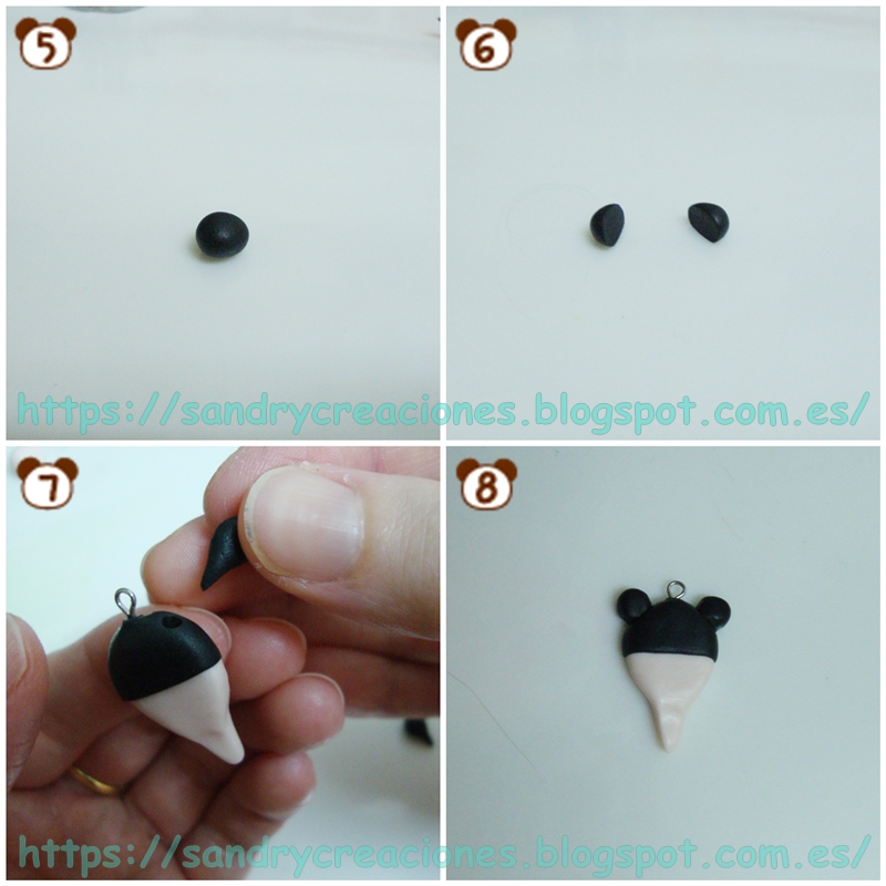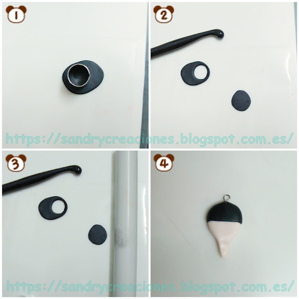 Nota: La hembrilla para realizar el colgante se puede introducir antes de poner la pasta polimérica negra para el pelo o bien una vez tengamos puesta la pasta polimérica negra del pelo. También podemos esperar a tener la figura horneada y endurecida para realizar un pequeño agujero y pegar una hembrilla con cola. Nosotros preferimos introducirla antes de hornear la figura de esta manera cuando se endurece la figura en el horno la hembrilla ya queda sujeta y nos ahorramos hacer un agujero posterior.