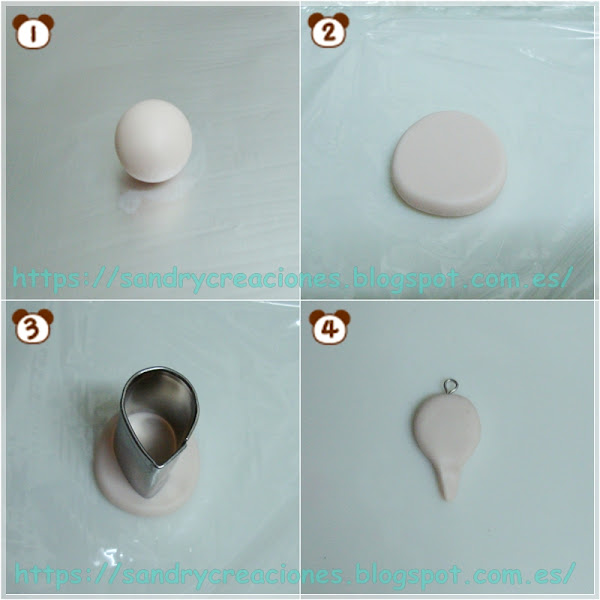 Para confeccionarlas empezamos por su cabeza que realizamos a partir de una bola de color carne (imagen 1) de 1 cm de diámetro más o menos, que aplanamos (imagen 2) y con ayuda de un molde cortamos en forma de gota y le fuimos dando forma para que acabara en punta y así poder unirla bien mas adelante al cuerpo de la muñeca (imágenes 3 y 4).