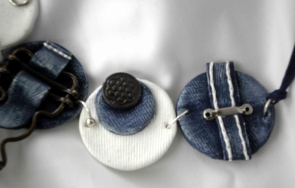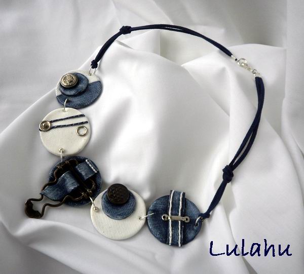 Este collar me lo encargó una amiga. Está hecho con tela de una camiseta vieja y canicas. En mi blog tengo publicado el PAP de uno parecido.