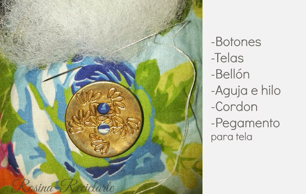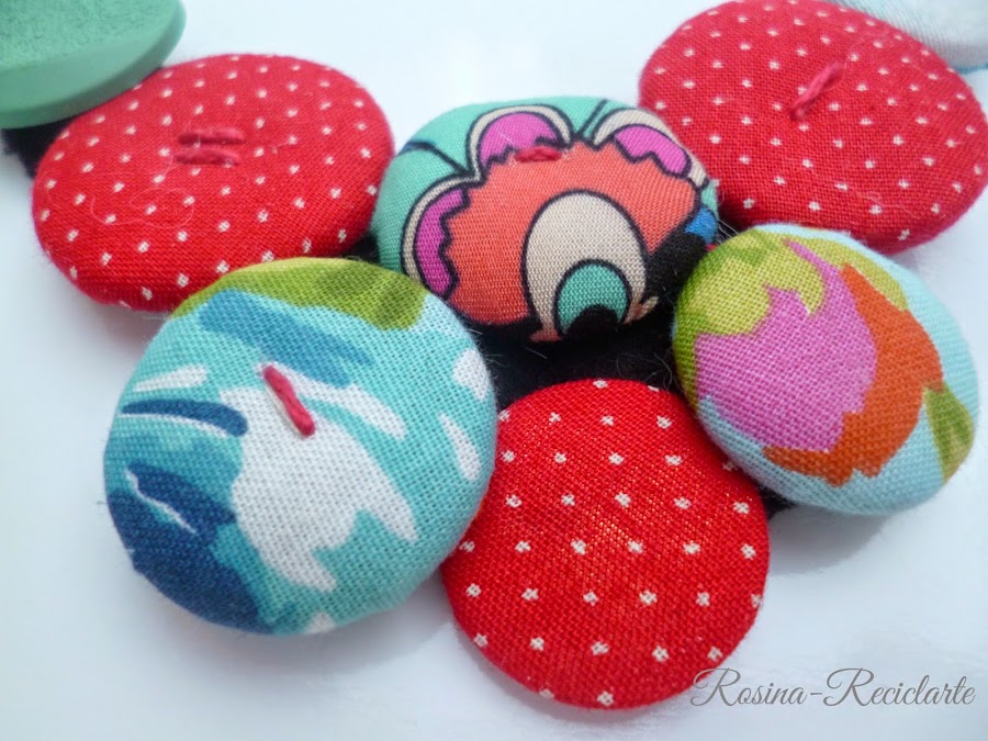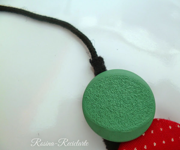 Recorté siguiendo el contorno de los botones, y cosí un par de cordones de zapatos( si!! cordones de zapatos) para atarlo luego al cuello.
