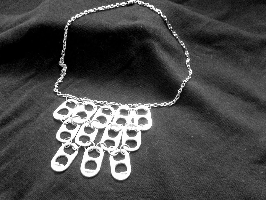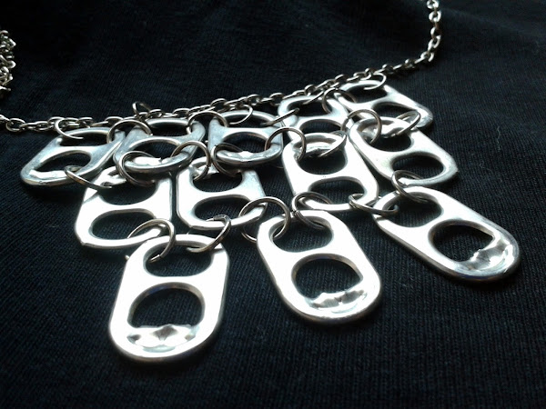 La técnica es muy sencilla: unir con aros las anillas en la forma que queramos, y unir éstas a una cadena, a la que le pondremos un cierre. Lo mejor es usarlo todo plateado para que quede del mismo color que las anillas. Es importante recortar bien el trocito de metal que une la anilla al bote para no cortarnos, y doblar cualquier trocito que pueda quedar.