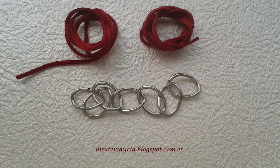 Empezaremos cortando un trozo de cadena, vamos a utilizar 7 eslabones y dos trozos de hilo de antelina de unos 40 cm cada uno. Si queréis el collar mas largo cortad unos centímetros mas.