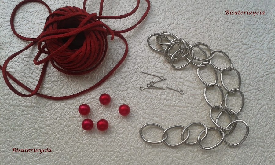 Hilo de antelina, cadena con eslabones grandes, bastones para pendientes, bolas, terminales y cierre.