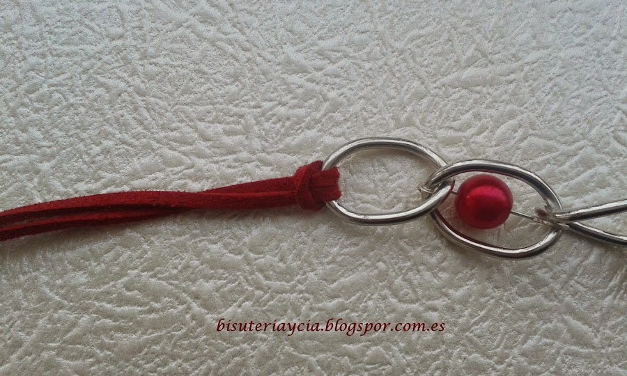 Una vez colocadas las bolas ataremos los hilos de antelina a ambos lados de la cadena con un nudo alondra. Puedes ver como hacer el nudo aquí.