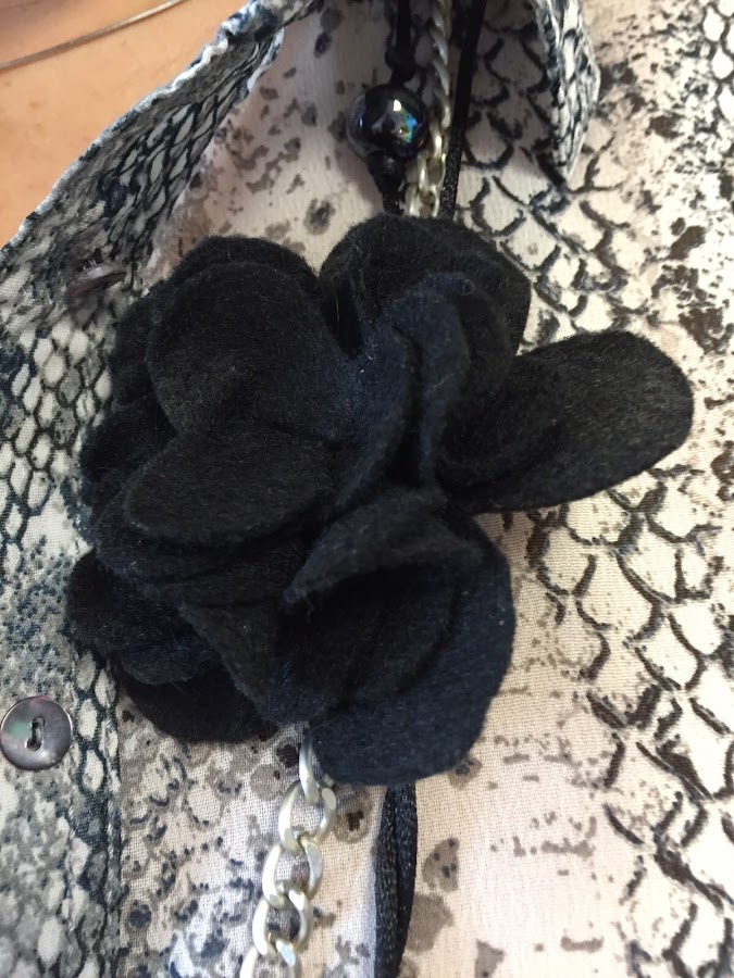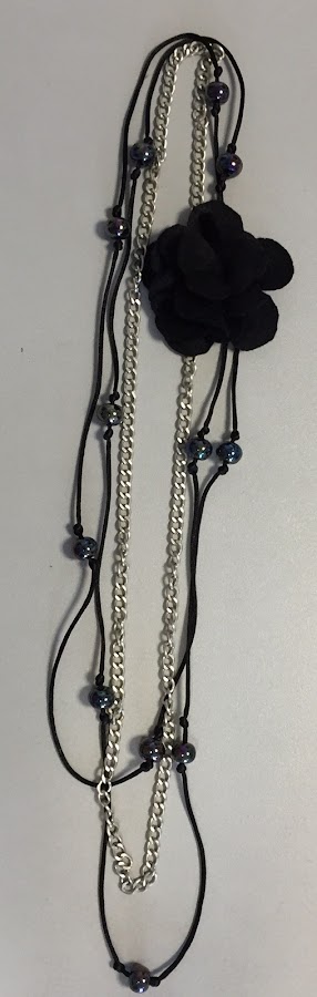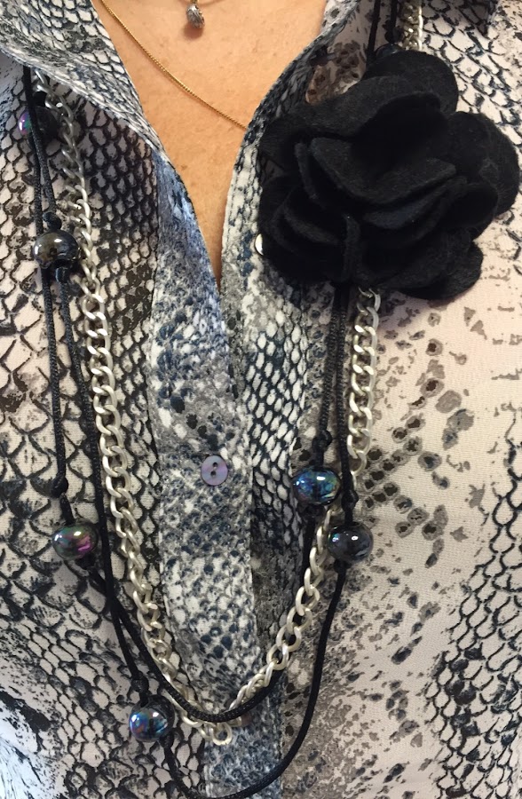 Se puede poner sólo la flor como broche, sólo el collar o ambos tal y como aquí aparece. El collar es muy versátil, pues se puede usar con o sin cadena; vamos, "tres en uno" según el momento.