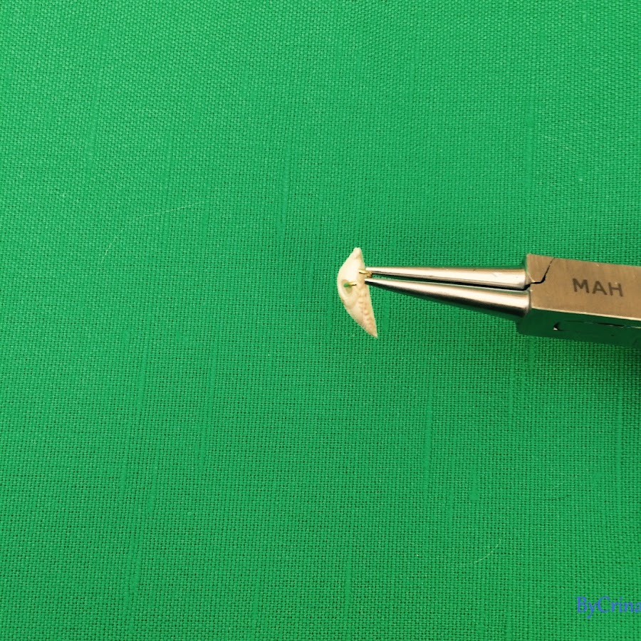Con la ayuda de los alicates abrid el aro más grande y coladlo por el agujero de la concha. Cuando ya esté colocado, cerradlo usando lo alicates.