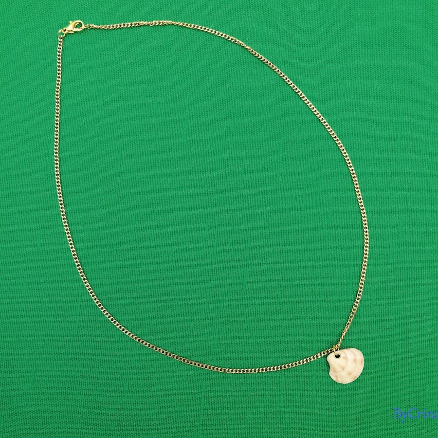 Para empezar necesitamos una concha, tengo la suerte de que la mía viene con agujero incluido. Un trozo de cadena de 40 - 45cm, dos aros pequeños, un aro más grande que los anteriores y un cierre.