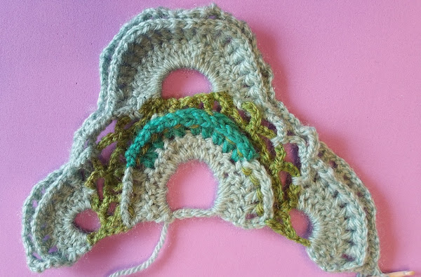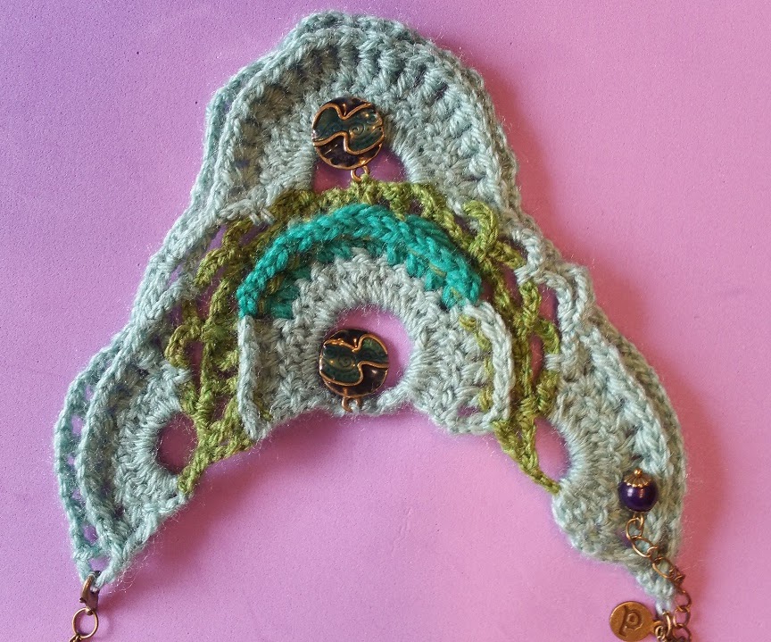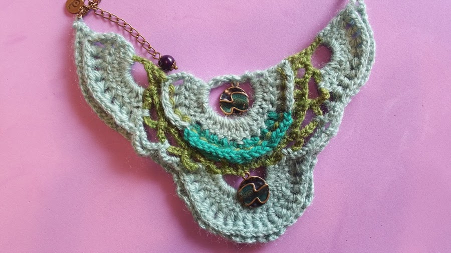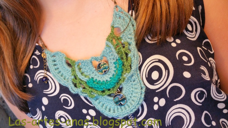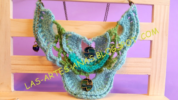 Me encantan los collares de crochet, esta creación, la podeis hacer en dos versiones , de invierno en lana y de verano en algodón , rafia, cuerda.... este es de lana, con gamas de verdes ,son restitos de otras labores que siempre guardo y me han venido genial para este proyecto