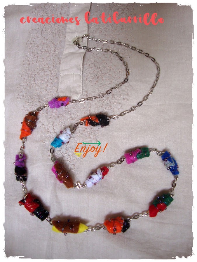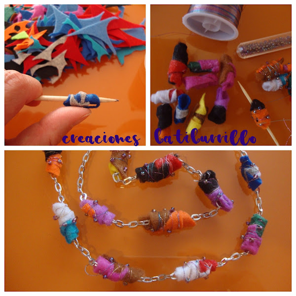 Lo que he hecho ahora, ha sido decorarlas con hilo brillante multicolor enrollado y pequeños abalorios cosidos, y engranarlas en una cadena plateada.