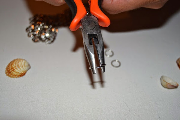 4- Enganchamos las anillas con las conchas a la cadena y cerramos las anillas con los alicates.