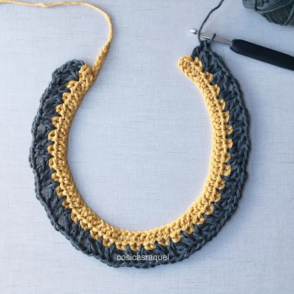 Pensé en hacer uno de esos que se cosen a la camiseta pero como soy tan torpe cosiendo opté por la opción de quita y pon , lo único que tienes que mirar es el número de cadenetas esa será la largura del collar , lo mejor es que te lo pruebes para ver si te gusta.