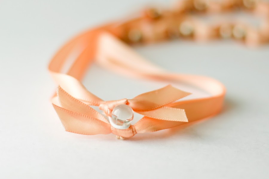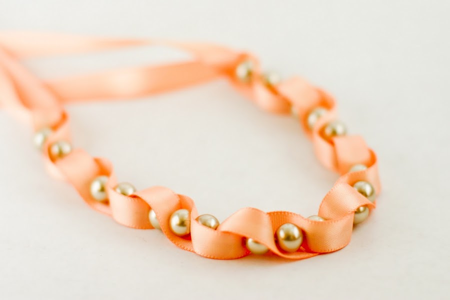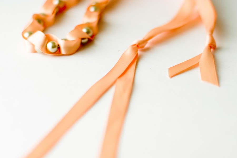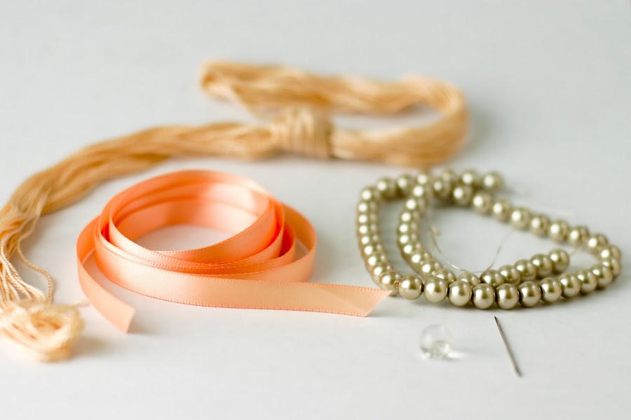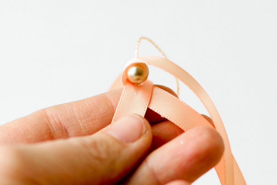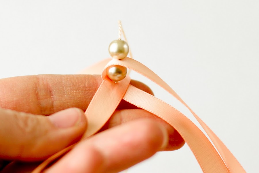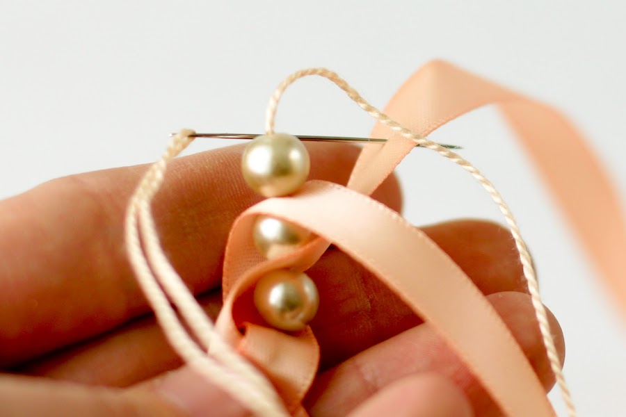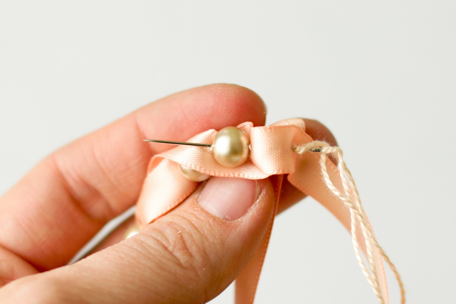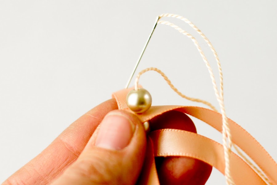 Tome una de las largas colas de cinta, hilo de la seda del bordado a través de él de tal manera que la cinta se apoya muy bien en la parte superior de la perla, sin una gran diferencia. Usted no se va a utilizar las 10 colas "de la cinta, así que ignore estos y mantenerlos separados de las colas más largas.