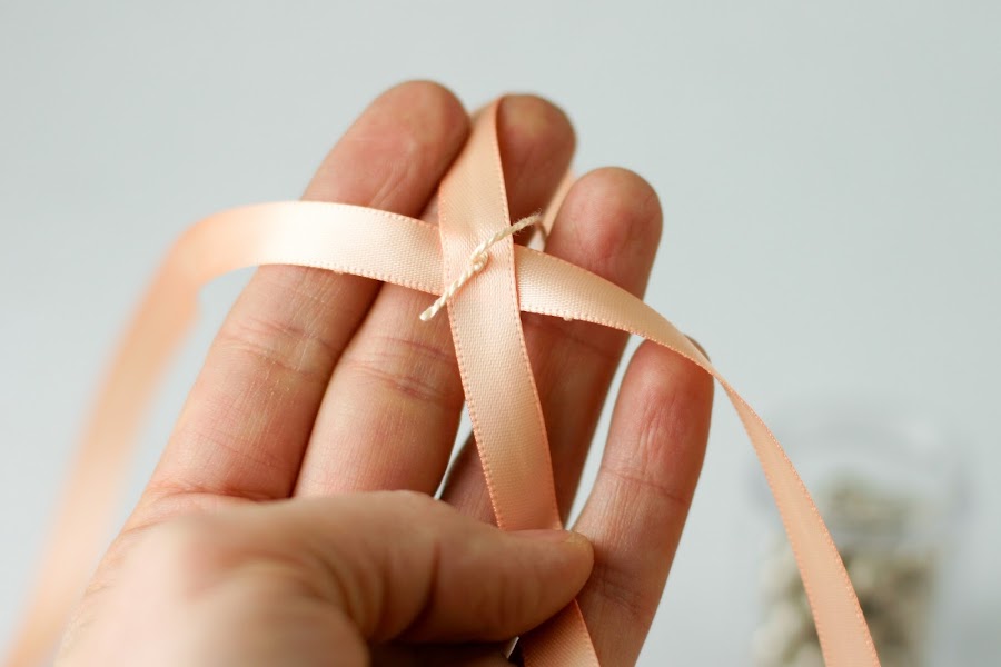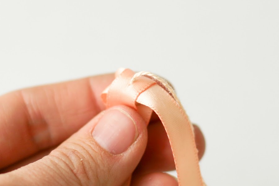 Corte dos 36 "pedazos de la cinta. Cruce a cerca de 10 pulgadas en el hilo y comenzar a en el centro de las cintas. Que meter la cola en el bucle al menos dos veces.