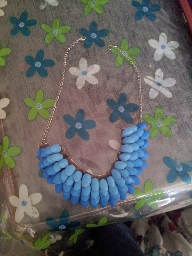 Cuando los pistachos pintados ya se hayan secado, iremos pegándolos al cartón con el pegamento fuerte. les echaremos pegamento sólo por la parte de atrás y los laterales, que serán lo que estará en contacto con el cartón o los demás pistachos. Iremos pegandolos poco a poco hasta que esten todos, y el cartón que nos quede sin pistachos una vez hayamos terminado el collar lo recortaremos con cuidado y ¡Listo!