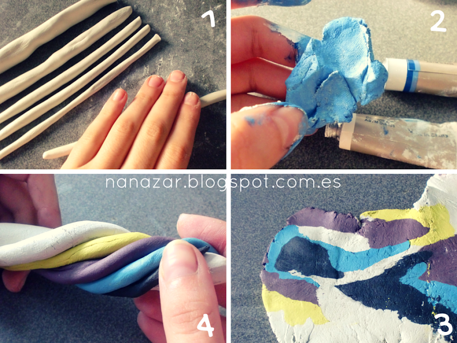 El caso es que primero, tendremos medir la cantidad de masa que queramos utilizar (1) Una vez divida, con pintura acrílica la vamos a mezclar con las particiones de pasta que hayamos hecho previamente (2) Una vez que tengamos los colores que queramos, de la intensidad deseada, la vamos a juntar de la forma que queramos, yo lo hice de esta (4) Y bueno, como veis en la imagen (3) aplastaremos toda la pasta con los colores juntos.