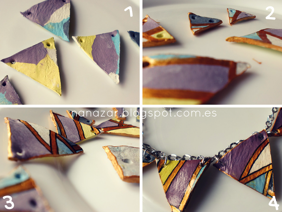 Aquí llega el momento “creativo” donde deberemos cortar las zonas con los colores que nos interesen. Yo decidí hacer triángulos de diferentes tamaños (y otras figuras que no muestro) Recuerda que para poder engancharlo deberás crear un agujero con un punzón en los extremos. (1)