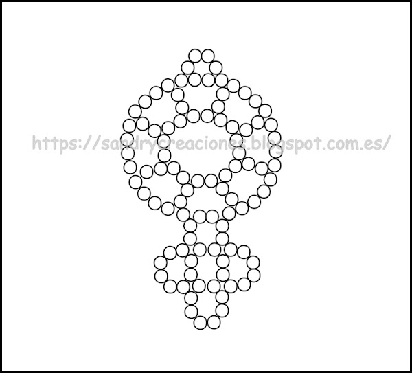 Para realizar los dos símbolos usamos 1 metro apróx. de hilo metálico de 0,28 mm de color rosado y 98 rocallas para cada uno. Para montarlos hemos utilizado la técnica de enfilado cruzado y lo hemos hecho siguiendo este esquema: