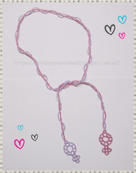 Para realizar el enfilado de este collar y el montaje del símbolo de la mujer lo hemos hecho utilizando las técnicas básicas de enfilado en bisutería que explicamos en una entrada anterior que podéis ver o recordar AQUÍ , concretamente utilizamos la técnica de enfilado lineal múltiple para realizar el cordón del collar y la técnica de enfilado cruzado para realizar los dos símbolos de la mujer.