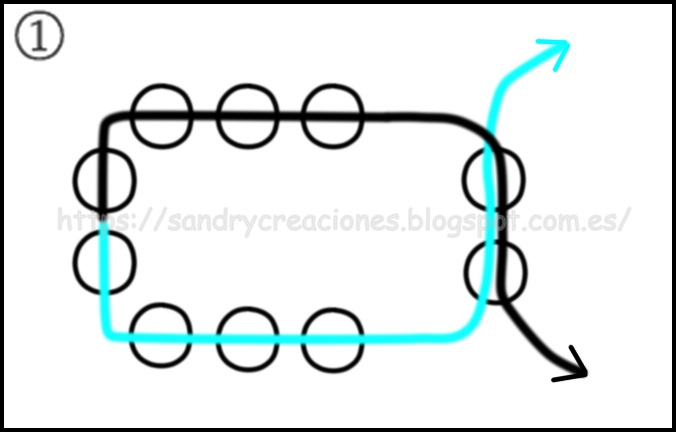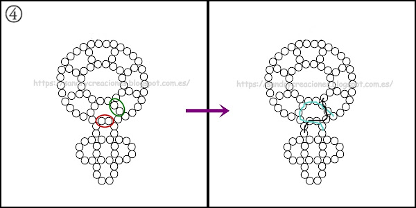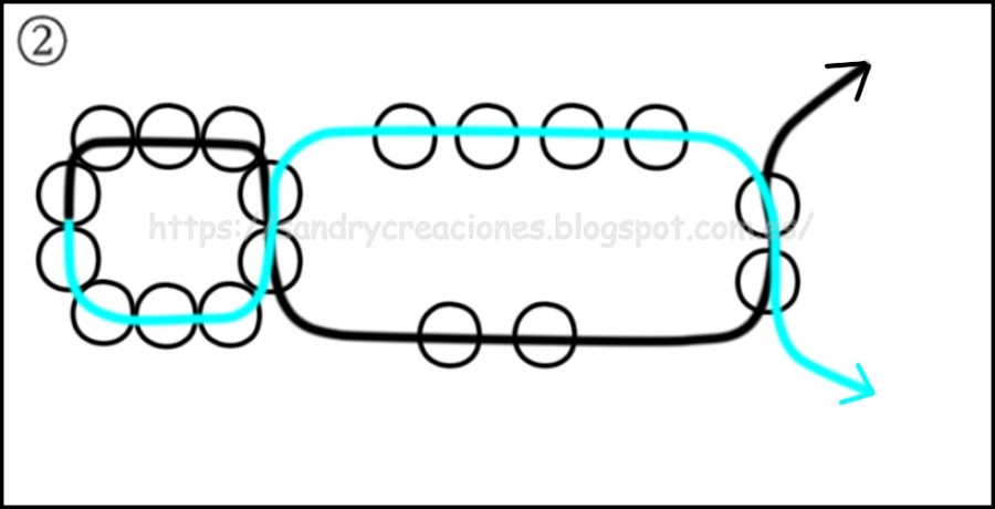 Paso 9 - Siguiendo del paso anterior enfilamos 2 rocallas a cada extremo del hilo y seguidamente 2 rocallas más en las cuáles cruzaremos los dos hilos (parte inferior del esquema). A partir de aquí con los dos extremos sobrantes de hilo si queréis podéis ya anudarlos y terminar el motivo aquí o bien podéis hacer como hicimos nosotros que lo volvimos a pasar por las rocallas exteriores bordeando el motivo para dejarlo más consistente y de esta manera aprovechar para hacerle un enganche en la parte superior agregando 4 rocallas más.
