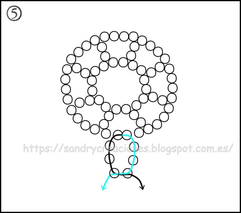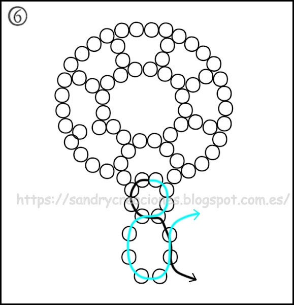 Paso 3 - Seguimos realizando el tercer círculo del motivo de la misma forma que el segundo del paso anterior, es decir, enfilamos 4 rocallas en el extremo de hilo superior y 2 rocallas en el extremos de hilo inferior y seguidamente enfilamos dos rocallas más por las cuáles cruzamos los dos extremos del hilo. A partir de aquí seguimos hasta realizar 7 círculos hechos en rocalla que a su vez van formando un circulo más grande. Una vez tenemos los 7 círculos hechos vamos a hacer el último para cerrar el circulo grande y lo hacemos enfilando en el extremo superior 4 rocallas y en el inferior 2. Seguidamente cruzamos los dos hilos por las rocallas del primer circulo que se indican en la imagen (marcados con un círculo verde).