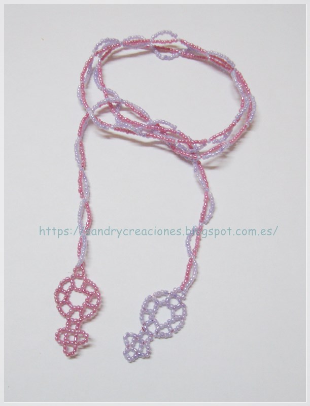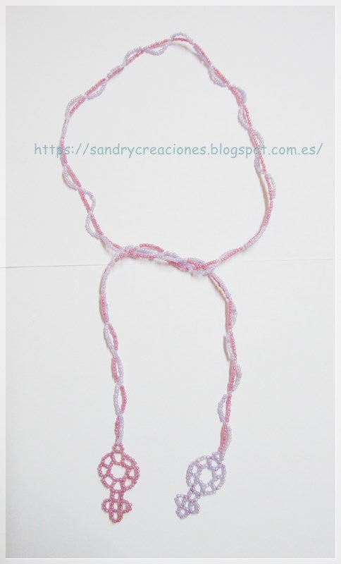 Paso 3 - En uno de los hilos enfilamos tantas rocallas como queramos hasta lograr la longitud deseada siguiendo la serie de 9 rocallas rosas - 1 rocalla lila hasta acabar con 9 rocallas rosas. Cuando tengamos la longitud deseada pasamos el hilo sobrante por el otro símbolo que habíamos dejado apartado y lo aseguramos.