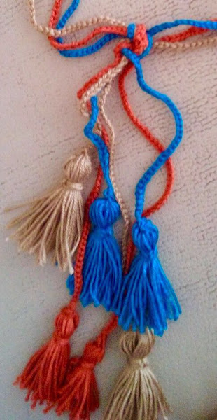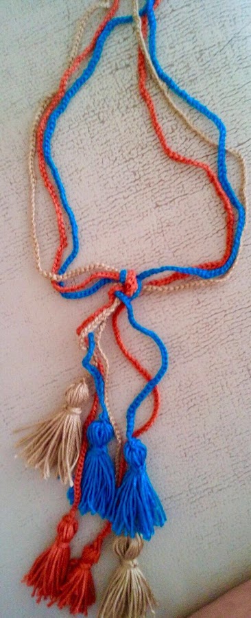 Este es un collar realizado con punto cadeneta y unos borlones. Realizado en hilo camel, caldera y azulina. Alegrará una simple camiseta o un jersey en invierno. ¿Os gusta? a mí me ha gustado mucho el resultado.