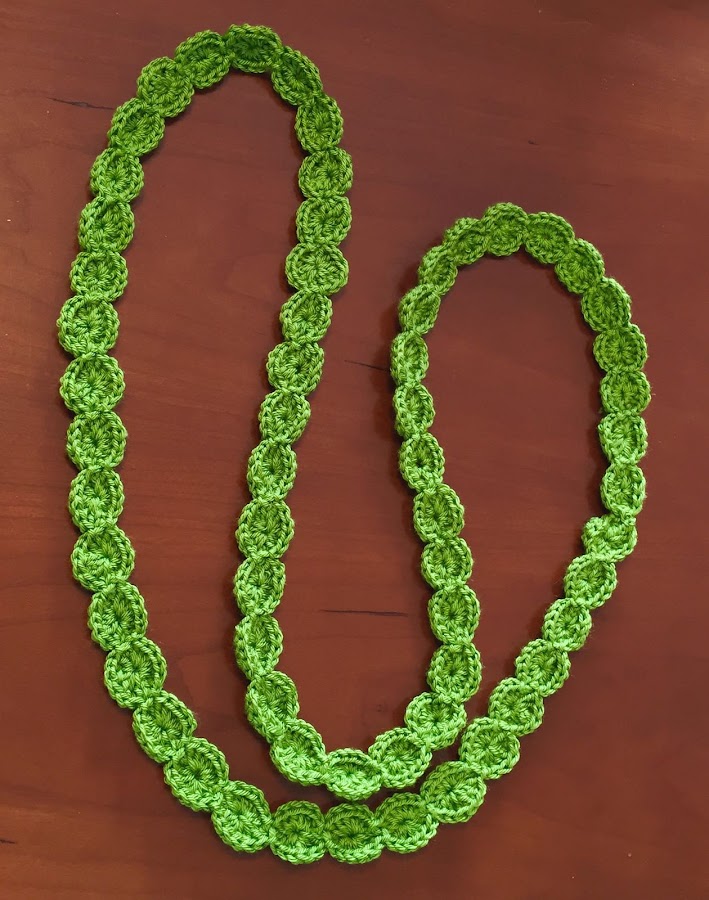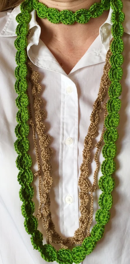 Los collares de ganchillo han sido todo un éxito, y aquí tenemos otro. Esta vez en verde, un color muy favorecedor para el verano. El largo del collar permite ajustarlo al cuello. Ya lo he entregado y sé que le ha encantado. ¿Y a vosotras, os gusta?