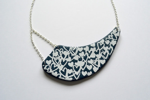 Esta vez el proceso es muy divertido: se trata de aplicar sobre la pieza cocida tinta transparente y polvos de embossing, que se pegarán a la tinta y se fijarán con pistola de calor. Esta técnica se suele aplicar en scrapbooking sobre papel, pero llevada al terreno de la arcilla polimérica, se consigue un resultado espectacular. Y, con la variedad de sellos y colores de polvos de embossing que hay en el mercado, las posibilidades son infinitas.