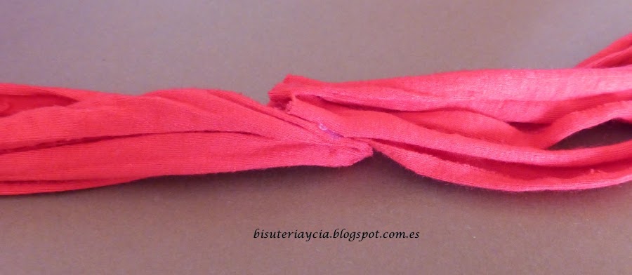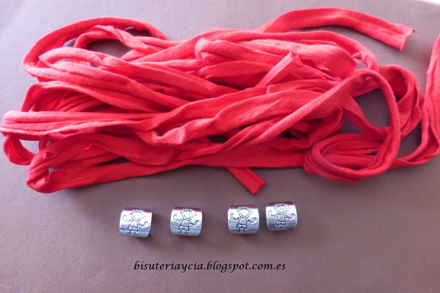 Como podéis ver las piezas que yo escogí tienen el orificio grande esto me permitió utilizar 4 tiras de trapillo.
