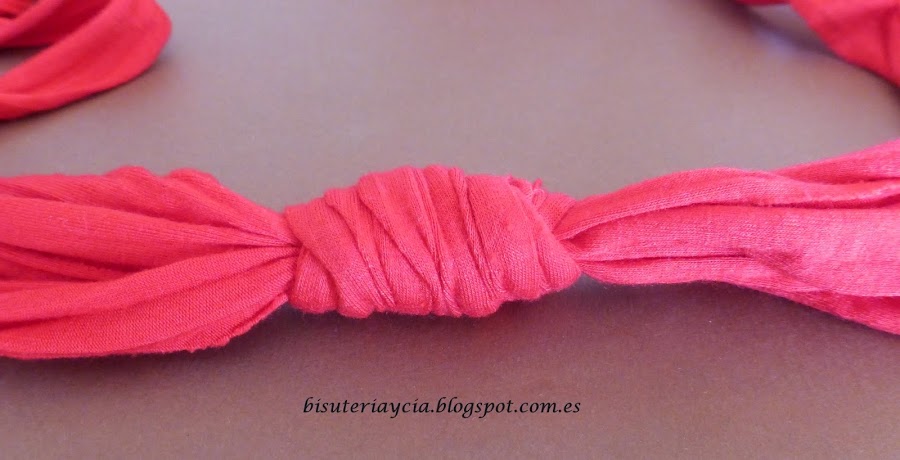 Para ello cortaremos un trozo de trapillo y lo enrollaremos alrededor de la unión, una vez enrollado cogeremos los extremos los pasaremos por el interior de las vueltas y los remataremos con un nudo para que no se nos deshaga.