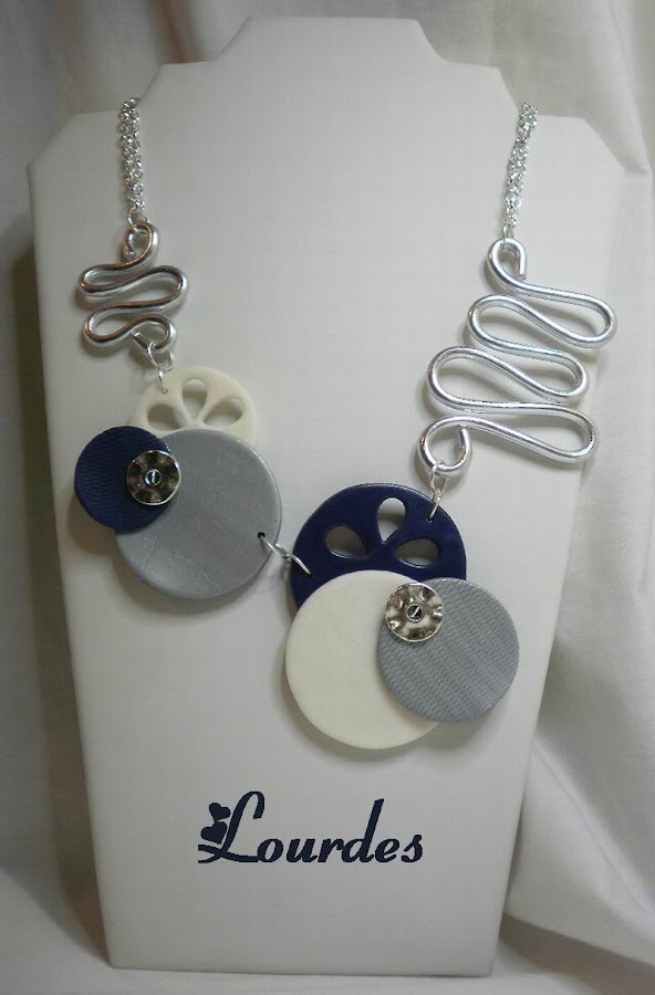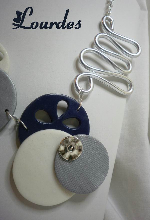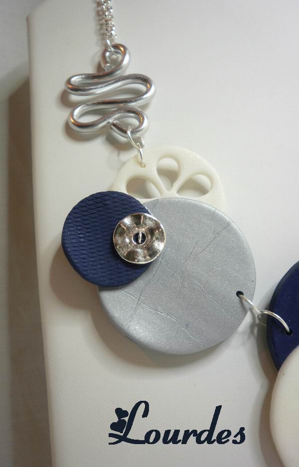 Collar largo con piezas realizadas en arcilla polimérica de diferentes tonos de gris plateado.El brillo de las piezas es a base de lijado y pulido lo que le da un aspecto más natural.Adornos metálicos y cadena plateadas.