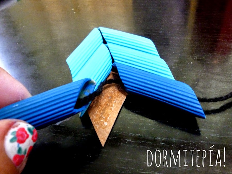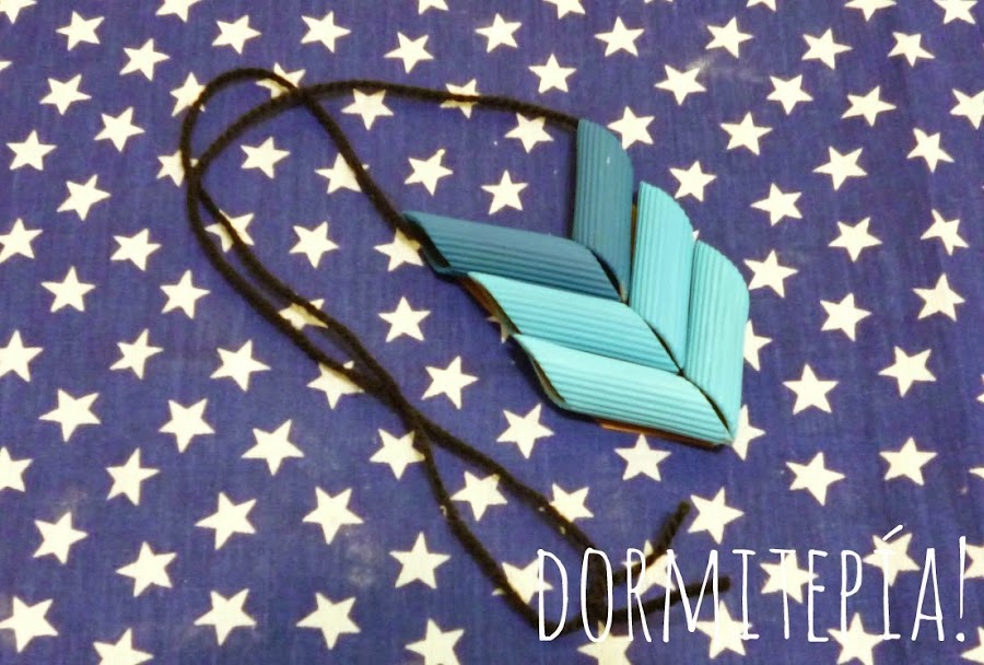 Cortamos un pedacito de lana del largo que queramos el collar y lo pasamos por el mostachol de arriba que está pegado, y a continuación por el que quedó suelto. Ahora sí lo podemos pegar.