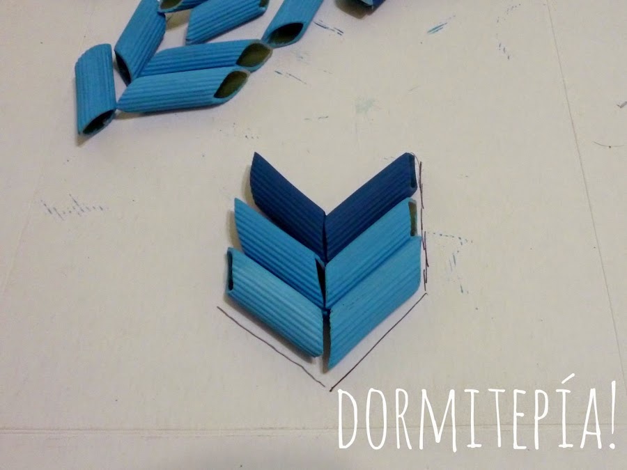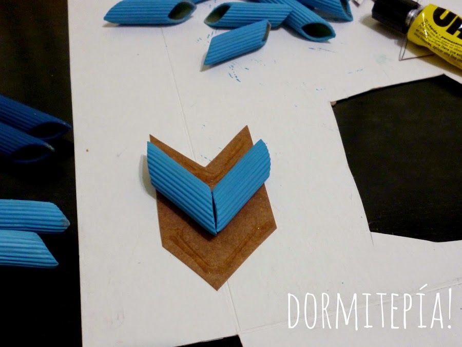 Con pegamento universal o pistola encoladora pegamos los fideos, yo empecé por los del medio para que no me faltara o sobrara cartón por los bordes. Pegamos todos excepto uno de los de arriba (derecho o izquierdo, es igual)