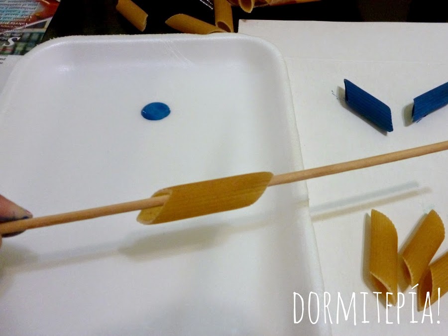 Entre las dos pintamos los fideos con acrílico, los sostuvimos con palitos de brochette para pintarnos los dedos lo menos posible.