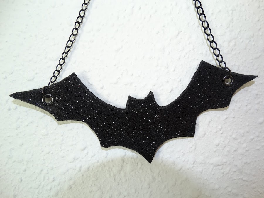 Es muy fácil de hacer. Dibujamos una patrón o cogemos uno de internet que hay muchísimos, lo pasamos a goma eva glitter negra, para reforzarlo lo he pegado sobre fieltro negro también. Después le hacemos un agujero en cada ala, ponemos un par de ojales y por último colocamos la cadena que más nos guste, en este caso la he puesto negra.