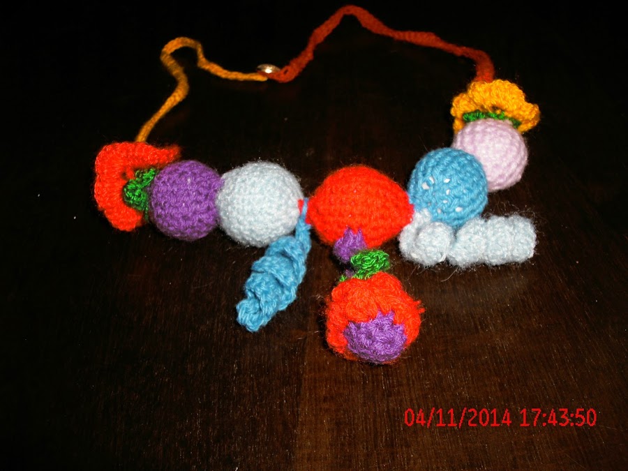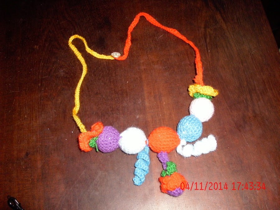 TODO ESTO SE ME OCURRÍA A MEDIDA QUE LO HACIA, ADEMAS LE COLOQUE DOS RULOS O BUCLES, A CADA LADO DE LA BOLITA CENTRAL, Y POR ULTIMO LE TEJÍ UNA TIRA LARGA DE CADA LADO Y LE COLOQUE UN BOTÓN PARA CERRAR, LA TIRA O CADENA LA REALICE DOBLE PARA QUE SEA MAS RESISTENTE, ESPERO LES GUSTE Y DEJEN ALGÚN COMENTARIO