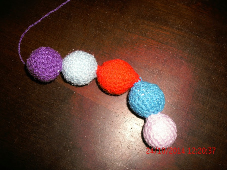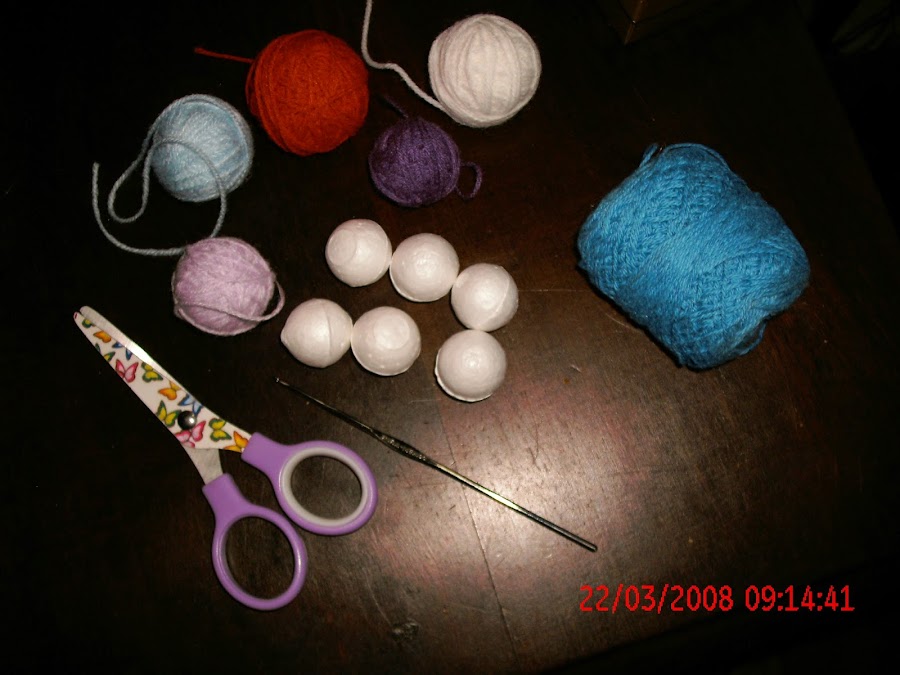 COMENSE FORRANDO LAS PELOTITAS DE TELGOPOR CON LOS DISTINTOS COLORES DE LANA, CUBRIÉNDOLAS CON MEDIO PUNTO EN CROCHET Y LAS UNÍ ENTRE SI.