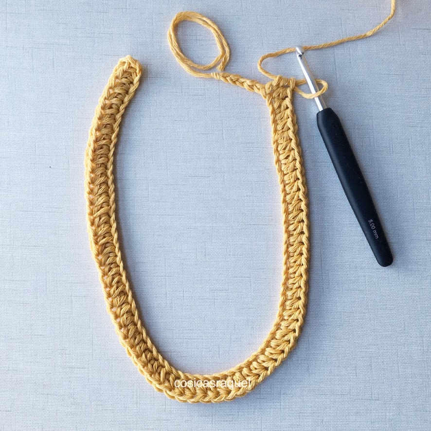 - Dejar un trozo de hilo al principio y hacer 5cad (para formar el ojal para el botón) + 70cad + 2cad para volver.