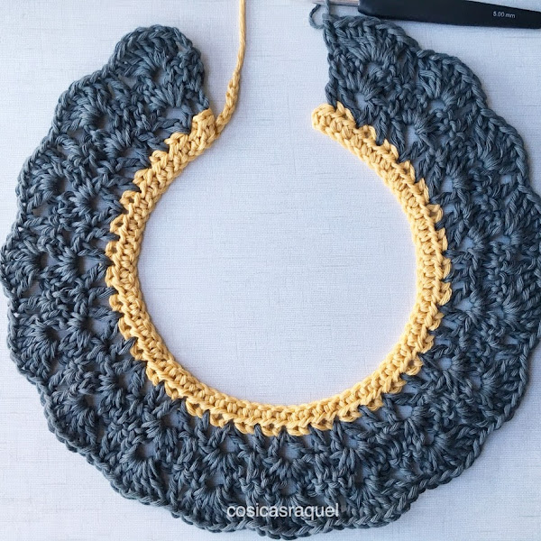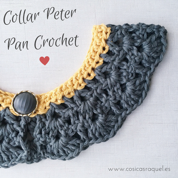 Pensé en hacer uno de esos que se cosen a la camiseta pero como soy tan torpe cosiendo opté por la opción de quita y pon , lo único que tienes que mirar es el número de cadenetas esa será la largura del collar , lo mejor es que te lo pruebes para ver si te gusta.