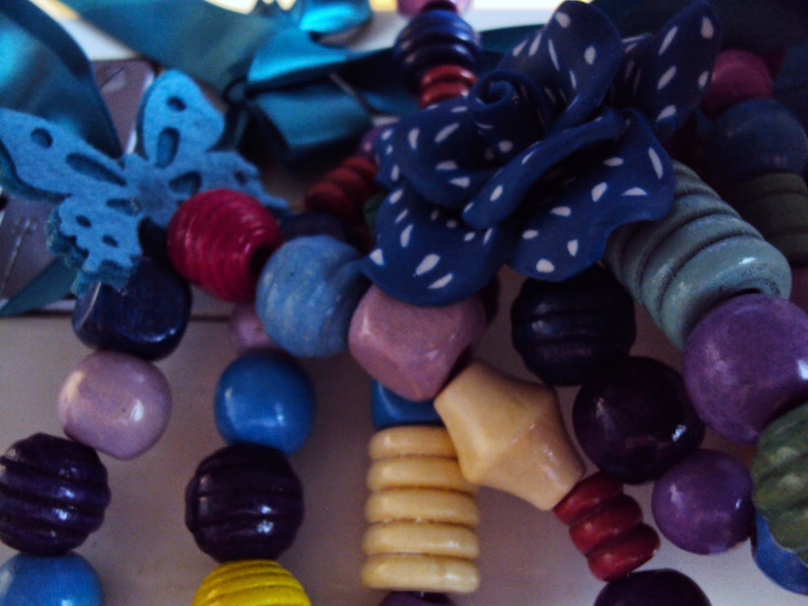 Se trata de un collar con cuentas de madera de colores pastel doble. El la parte superior lleva lazo y en la unión de este con las cuentas lleva una flor de fimo y una mariposa de fieltro. La mariposa y la flor son un regalo, en este caso no las he hecho yo a mano.