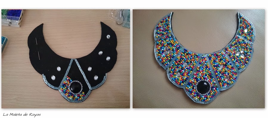 Éste lo hice multicolor, añadiendo un borde y delimitando por dentro también el collar. El procedimiento es muy sencillo pero eso sí, requiere de paciencia. Se trata de ir poniendo pegamento por el fieltro y colocar cuenta a cuenta, ayudándonos de una aguja para que queden rectos , hasta completar el collar.