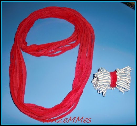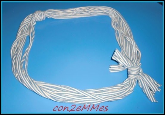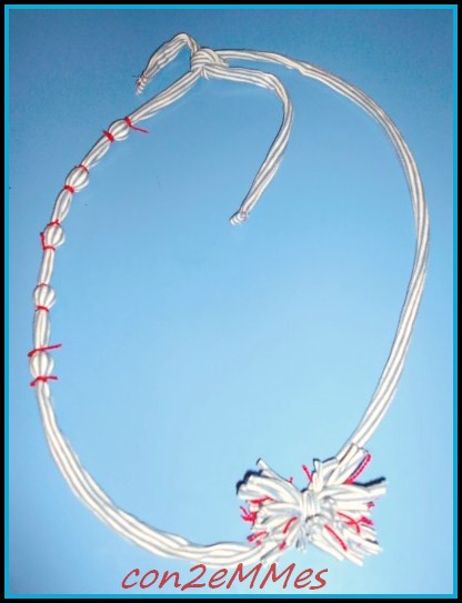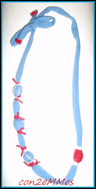 Collar rayas blancas y azul, con bolas y pompón y detalles rojos. Collar rayas blanco y azul con detalle lazo y nudo.Collares realizados reciclando camisetas.